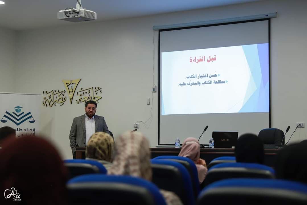 بتنظيم اتحاد طلبة كلية القانون-جامعة مصراتة- وبالشراكة مع صالون عقاد الثقافي. أقيمت يوم الثلاثاء الماضي الموافق 28 نوفمبر دورة تدريبية بعنوان أصول وآداب القراءة الجادة "التخصصية والثقافية" استمرت لمدة يومين متصلين هدفت إلى تقريب موضوع القراءة مقاربة منهجية وضبطها ضبطا صحيحا على المستويين التخصصي والثقافي.