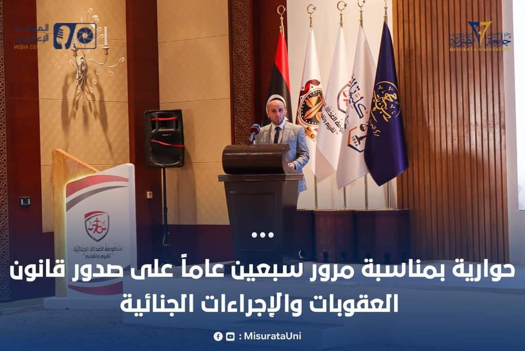 أقيمت صباح أمس الثلاثاء بمدينة طرابلس حوارية بعنوان "سبعينية التشريعات الجنائية"؛ وذلك بمناسبة مرور سبعين عاما على إصدار قانوني العقوبات والإجراءات الجنائية.